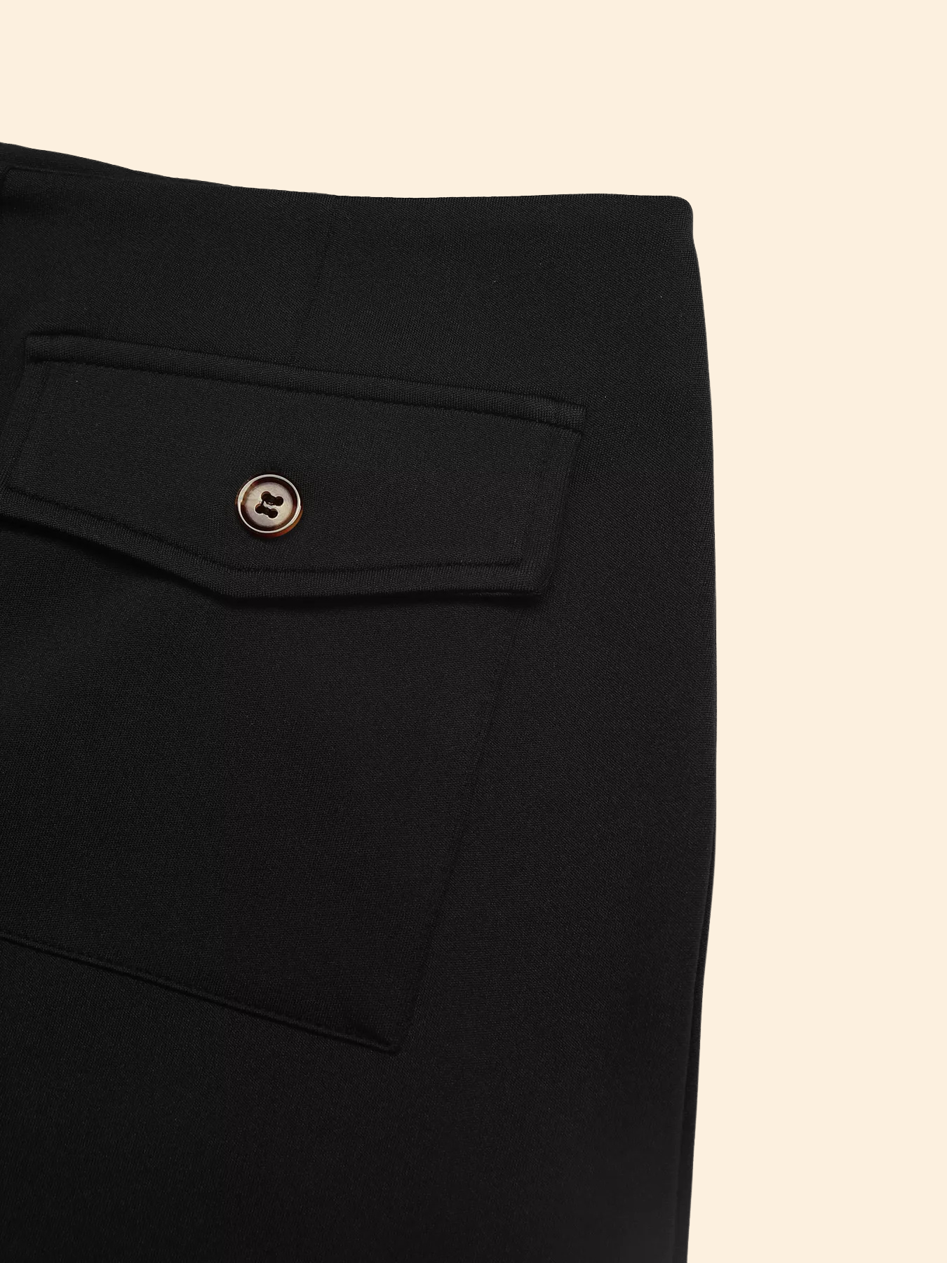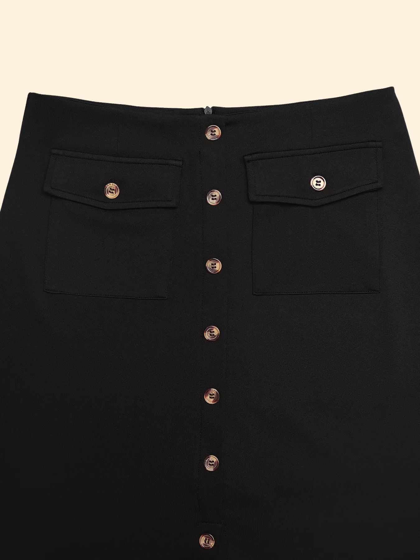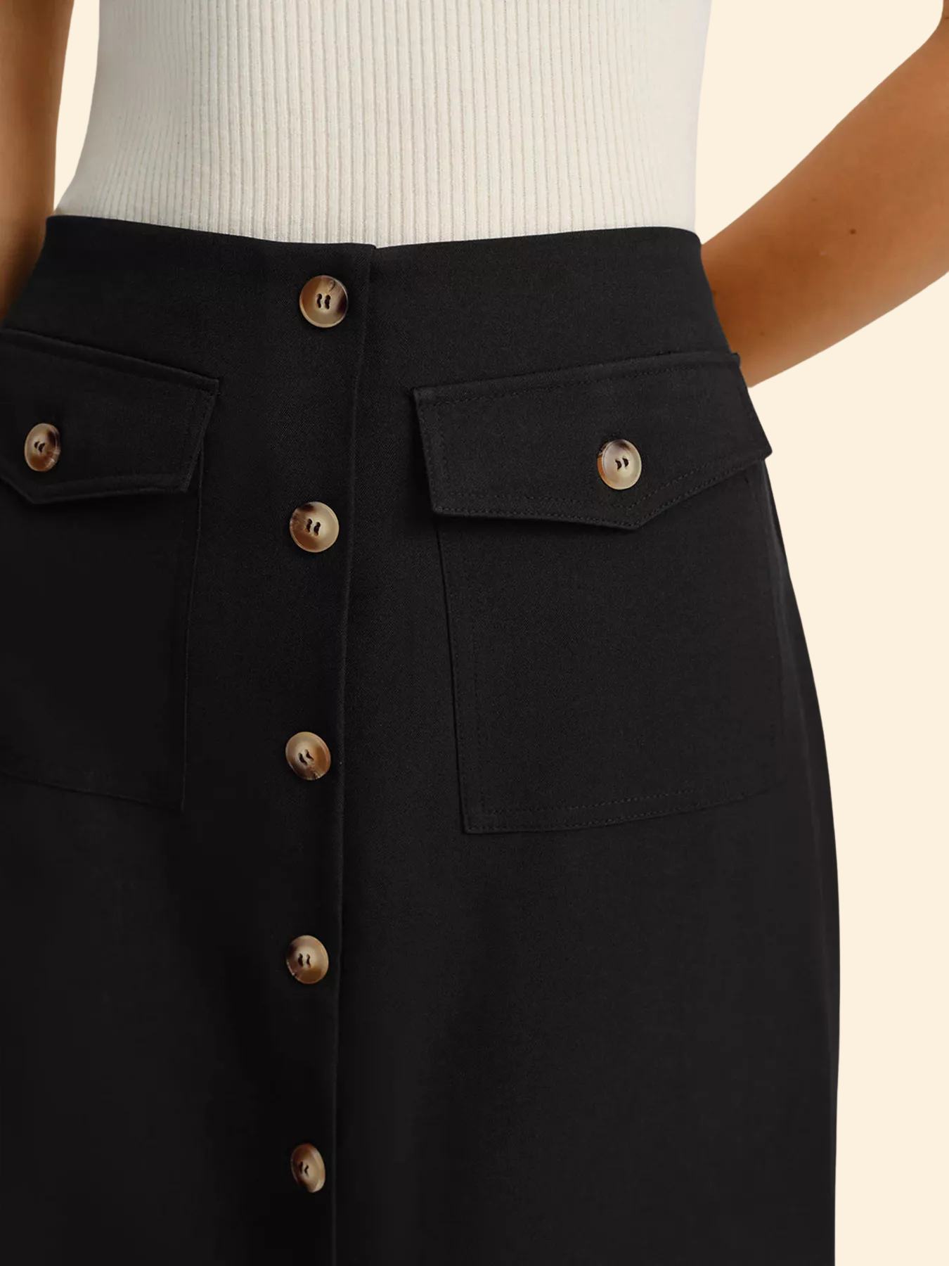 Der klassische Midirock mit Knopfleiste. Ein eleganter Midirock mit raffiniertem Knopfverschluss und praktischen Taschen. Das weiche, leicht dehnbare Material sorgt für angenehmen Tragekomfort, während der dezente Schlitz eine feminine Note verleiht. Perfekt für Büro und Abendgarderobe.
